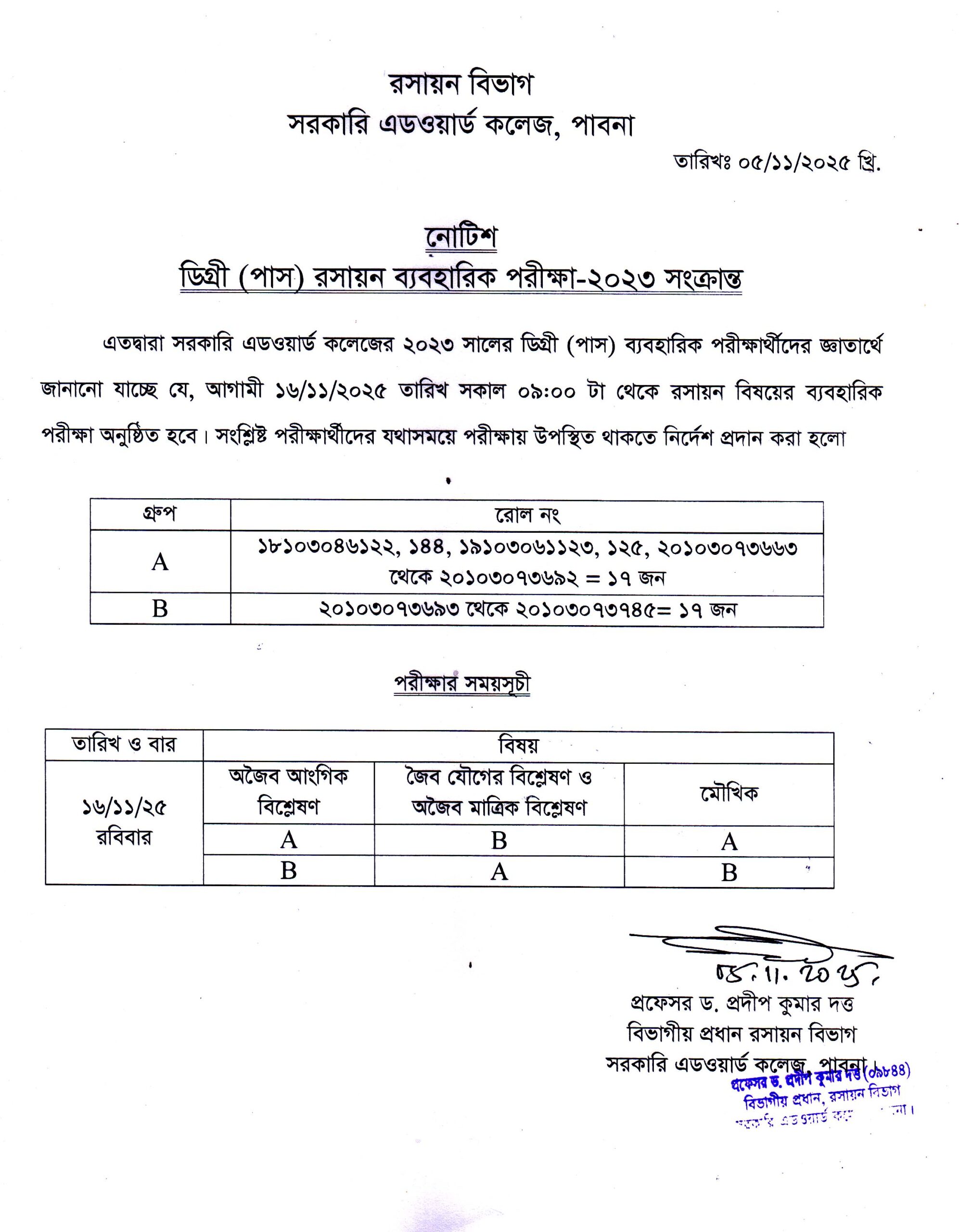 সরকারি এডওয়ার্ড কলেজ, দেশের ঐতিহ্যবাহী কলেজগুলোর মধ্যে অন্যতম। পাবনা শহরের প্রাণকেন্দ্রে এর অবস্থান। দেশ বিদেশে যার স্বর্নোজ্জল ও গৌরবোজ্জল পরিচিতিতে পাবনা গর্বিত। শত বছরের বেশি পুরাতন এ ঐতিহ্যবাহী প্রতিষ্ঠানের একটি গর্বিত বিভাগ হল রসায়ন বিভাগ। সরকারি এডওয়ার্ড কলেজের মূল ভবনে রসায়ন বিভাগের কার্যক্রম পরিচালিত হয়ে আসছে। ফলে এই বিভাগটি শত বছরের স্বতন্ত্র অবকাঠামো ও ঐতিহ্যের […]