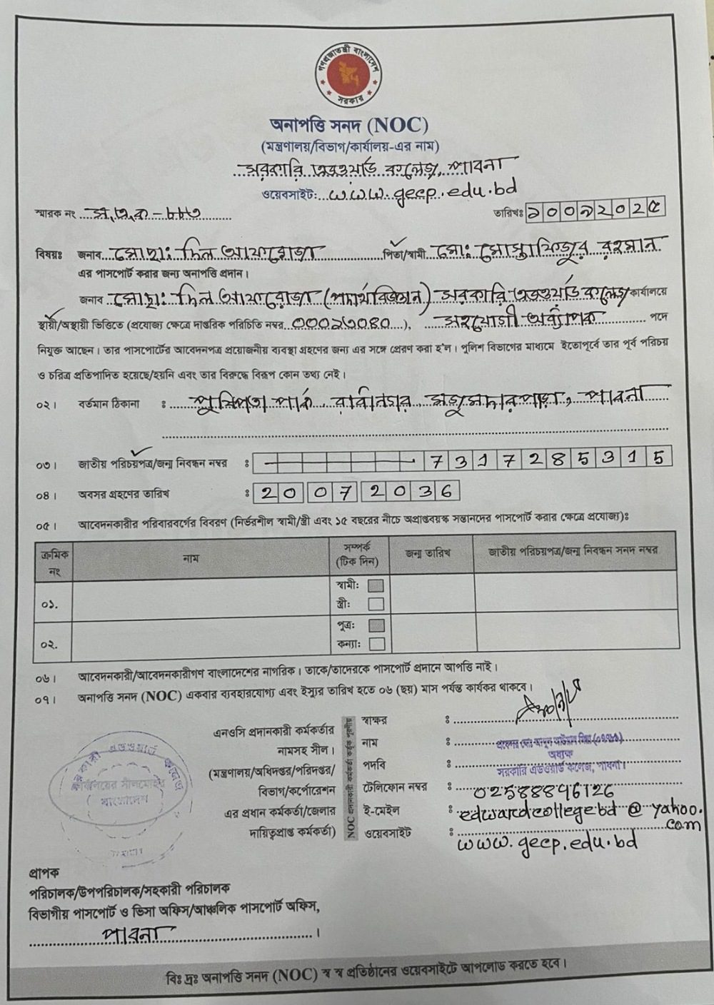 মোছা: দিল আফরোজা সহযোগী অধ্যাপক পদার্থবিজ্ঞান এর NOC