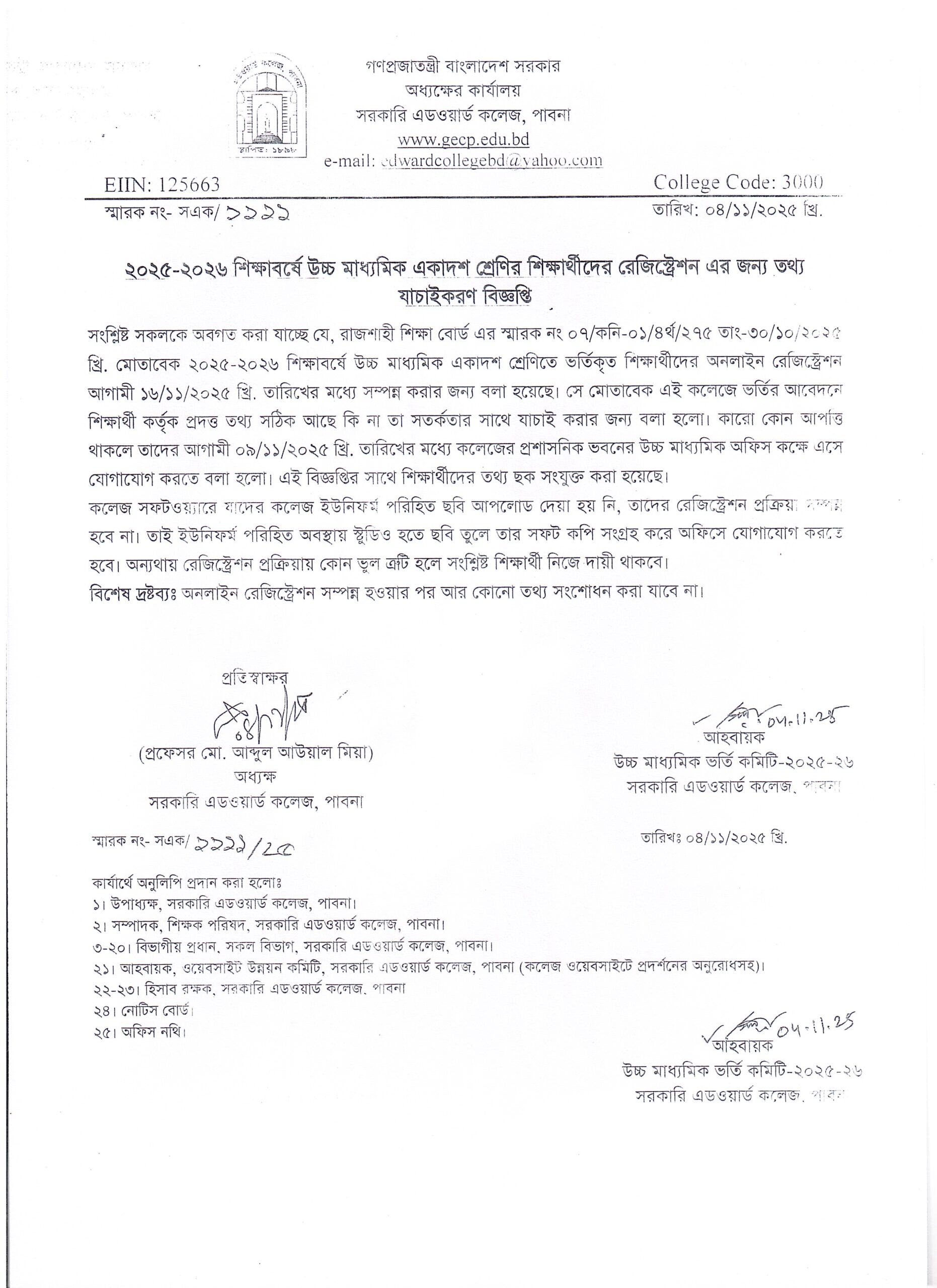| ২০২৫-২৬ একাদশ শ্রেণিতে 4র্থ পর্যায়ে ভতির বিজ্ঞপ্তি ও নিয়মাবলি |