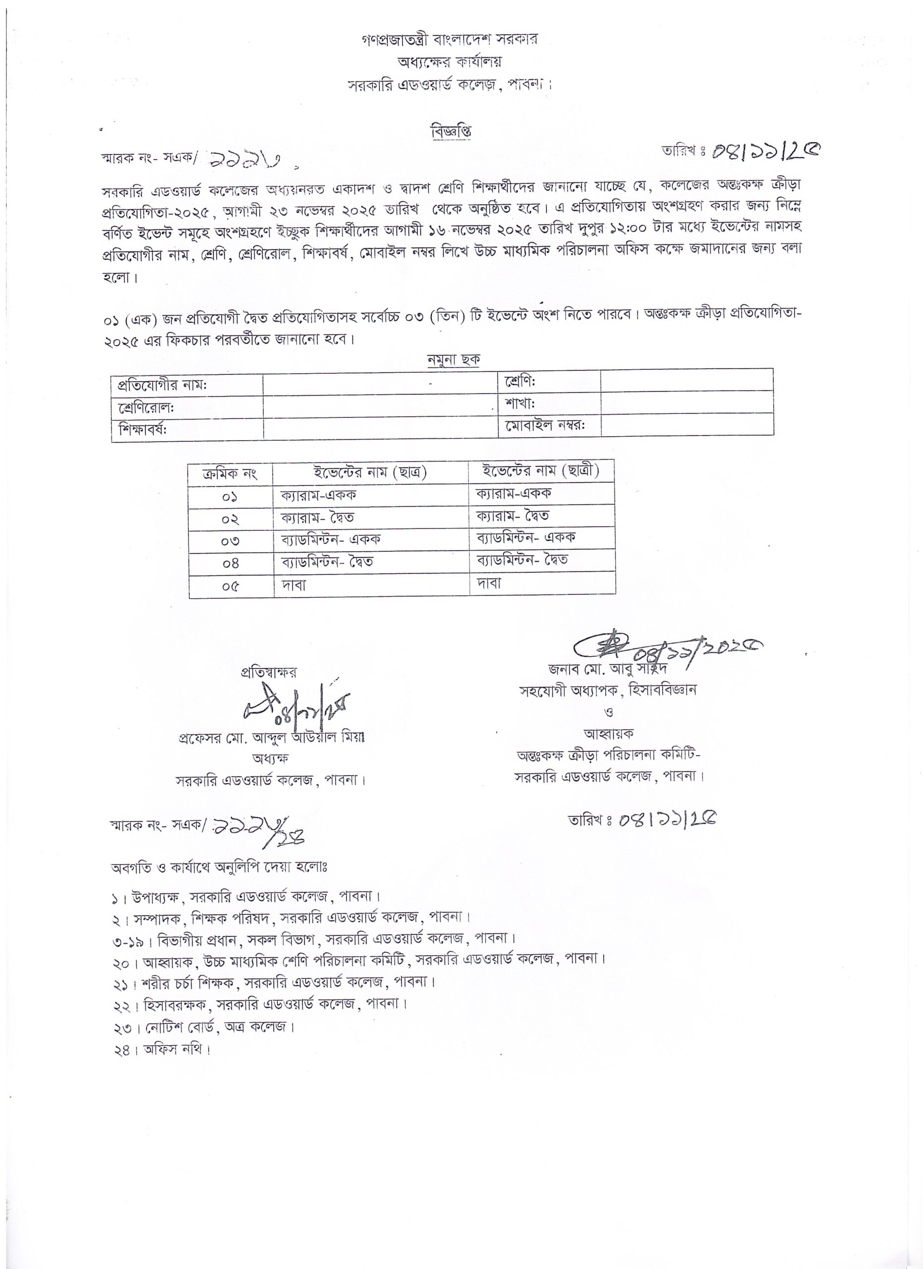 | আন্ত:কক্ষ ক্রীড়া প্রতিযোগীতা- 2025 (একাদশ ও দ্বাদশ শ্রেণি) |