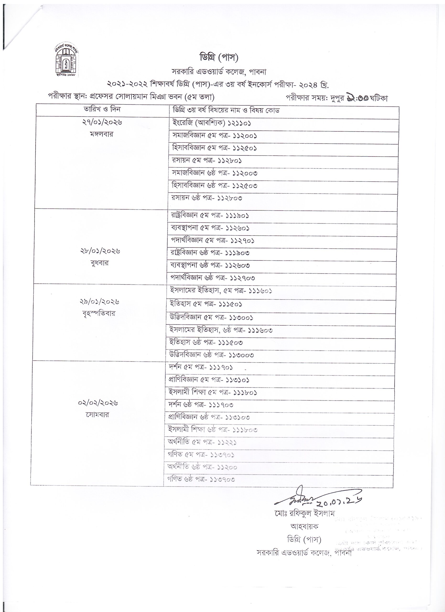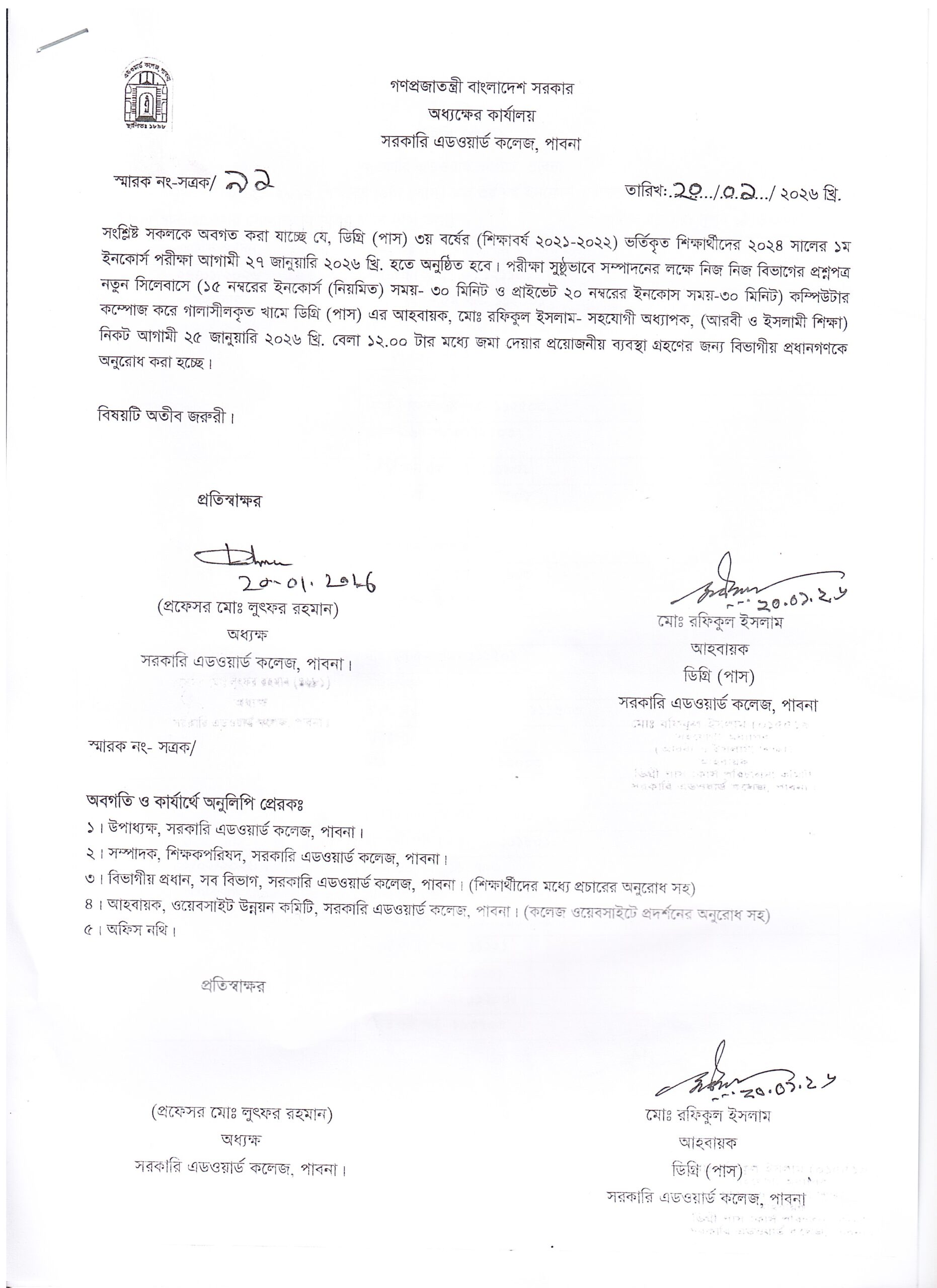 | ডিগ্রী পাস ৩য় বর্ষ ১ম ইনকোর্স পরীক্ষা ২০২৪ (প্রশ্নপত্র জমাদান) |